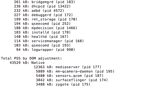 Analyzing your app using the data in Process Stats can reveal issues and suggest possible optimizations for your app. For example, if your app is running longer than it should or using too much memory over a period of time, there could be bugs in your code that you can resolve to improve your app's performance, especially when running on a device with low RAM.