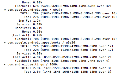 Procstats keeps track of how apps are running over time, providing data about their execution durations and memory use to help determine how efficiently they are performing. This is most important for apps that start services that run in the background, since it lets you monitor how long they are running and how much RAM they are using while doing so. Procstats will also collect data for foreground applications about memory use over time to determine the overall memory profile of the app.