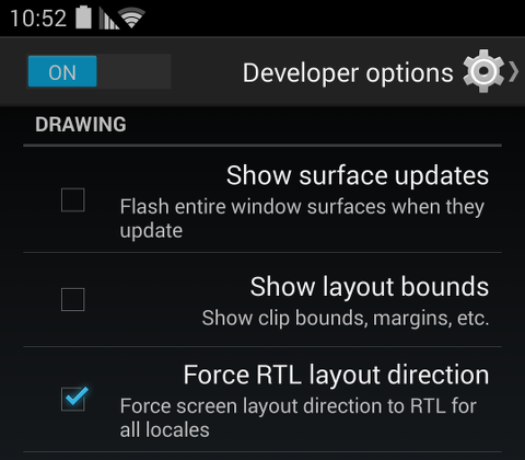 The Force RTL layout option switches the device to RTL layout for all locales and displays text in your current language. This can help you find layout issues across your app, without having to display the app in an RTL language. You can access the option in Settings > Developer options > Force RTL layout direction.