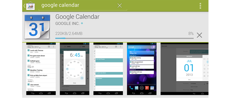 In this example, an activity bar (in Holo Dark) appears when a user first requests a download. There's an unknown period of time when the download has not yet started. As soon as the download starts, this activity bar transforms into a progress bar.