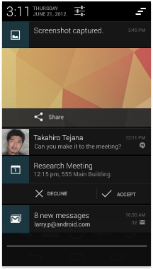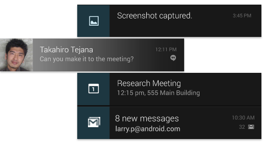 Notifications are brief messages that users can access at any time from the status bar. They provide updates, reminders, or information that's important, but not critical enough to warrant interrupting the user. Open the notifications drawer by swiping down on the status bar. Touching a notification opens the associated app. More on Notifications