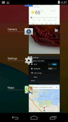 The Recents button at the right side of the navigation bar displays the apps that the user has interacted with most recently. They are organized in reverse chronological order with the most recently used app at the bottom.