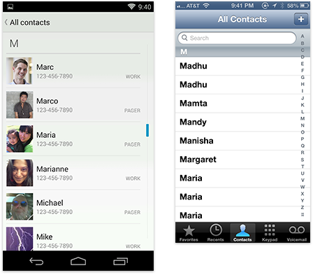 Android dialer with tabs in an action bar vs. bottom tabs in iOS.