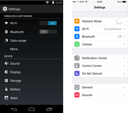Android settings without right-pointing carets in line items vs. iOS settings.