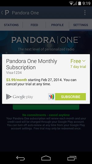 When users purchase subscriptions in your apps, Google Play handles all checkout details so your apps never have to directly process any financial transactions. Google Play processes all payments for subscriptions through Google Wallet, just as it does for standard in-app products and app purchases. This ensures a consistent and familiar purchase flow for your users and reduces cart abandonment rates.