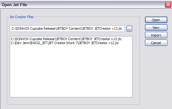 Open will open an existing .jtc (JET Creator file) file. Use the browser button to browse to the directory where you have saved your .jtc file.