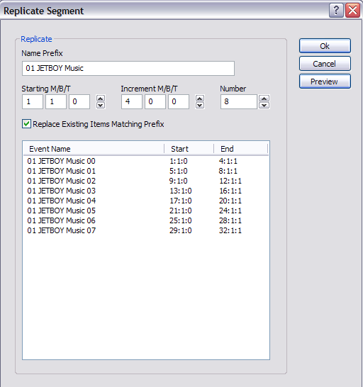 To make adding segments or events faster, use the Replicate command. Replicate can add multiple segments or events at one time and uses an offset parameter and prefix naming convention to keep things easy to read. The MOVE command is also useful for moving multiple events by a set number of measures, beats or ticks.