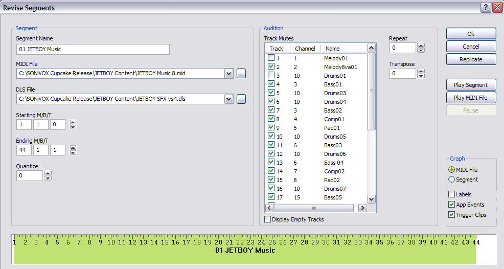Note: the audition attributes (mute flags, repeat and transpose) are not stored in the JET content file (.jet) but rather are defined by the game or application itself. In programming language, these settings correspond directly with the API calls to the JET engine. By including them here, the JET content author can simulate how the segment will respond to the applications API commands during game play.