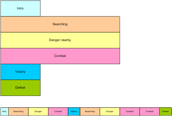 In this diagram, we see a non-linear music piece. The scenario is a first-person-shooter (FPS) and JET is providing the background music. The intro plays as the level is loading and then transitions under program control to the Searching segment. This segment is repeated indefinitely, perhaps with small variations (using the mute/un-mute feature) until activity in the game dictates a change.