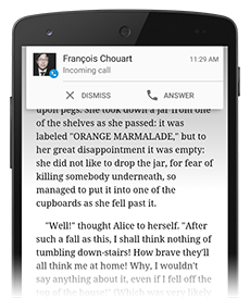 With Android 5.0 (API level 21), notifications can appear in a small floating window (also called a heads-up notification) when the device is active (that is, the device is unlocked and its screen is on). These notifications appear similar to the compact form of your notification, except that the heads-up notification also shows action buttons. Users can act on, or dismiss, a heads-up notification without leaving the current app.