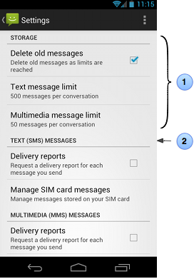 Every setting for your app is represented by a specific subclass of the Preference class. Each subclass includes a set of core properties that allow you to specify things such as a title for the setting and the default value. Each subclass also provides its own specialized properties and user interface. For instance, figure 1 shows a screenshot from the Messaging app's settings. Each list item in the settings screen is backed by a different Preference object.