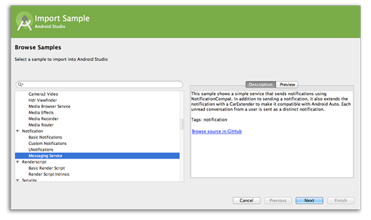 Start projects using template code for patterns such as navigation drawer and view pagers, and even import Google code samples from GitHub.