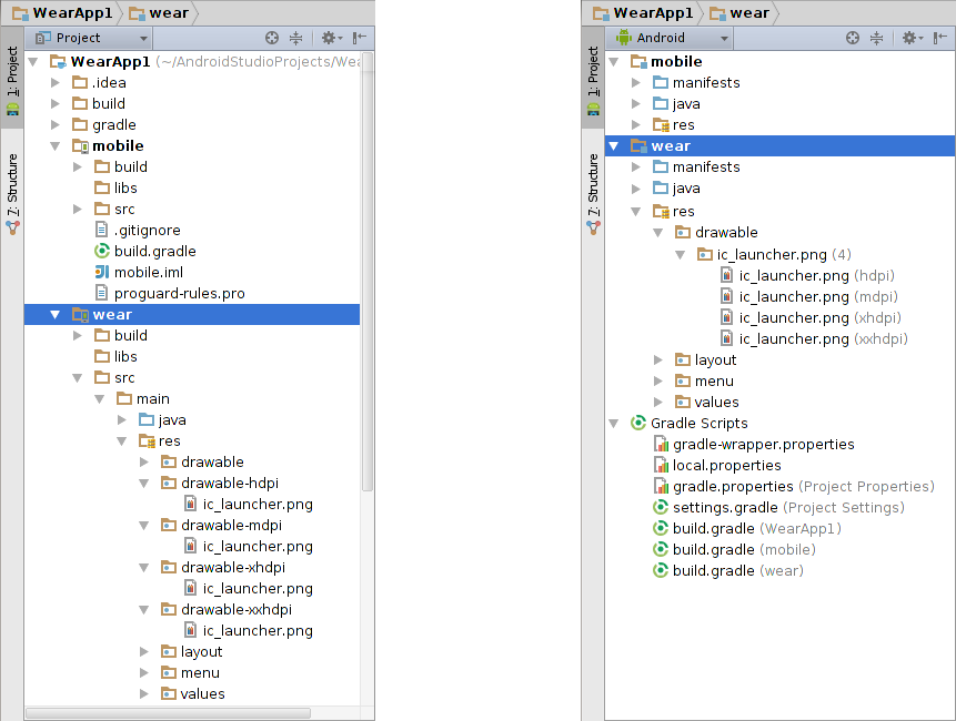 Figure 10: The traditional project view (left) and the Android project view (right).