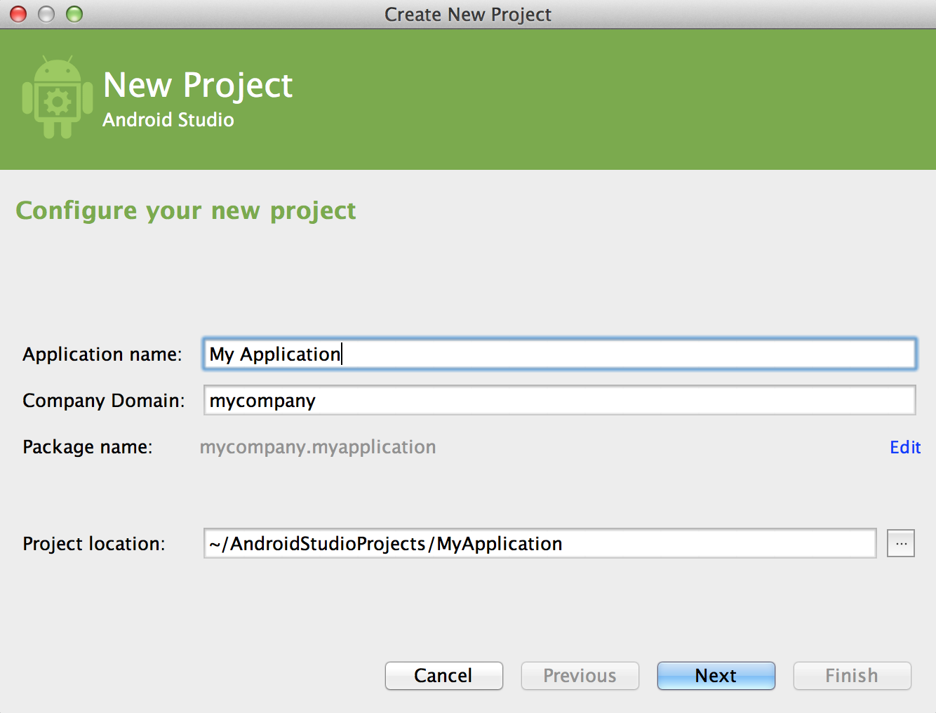 The next window lets you configure the name of your app, the package name, and the location of your project.