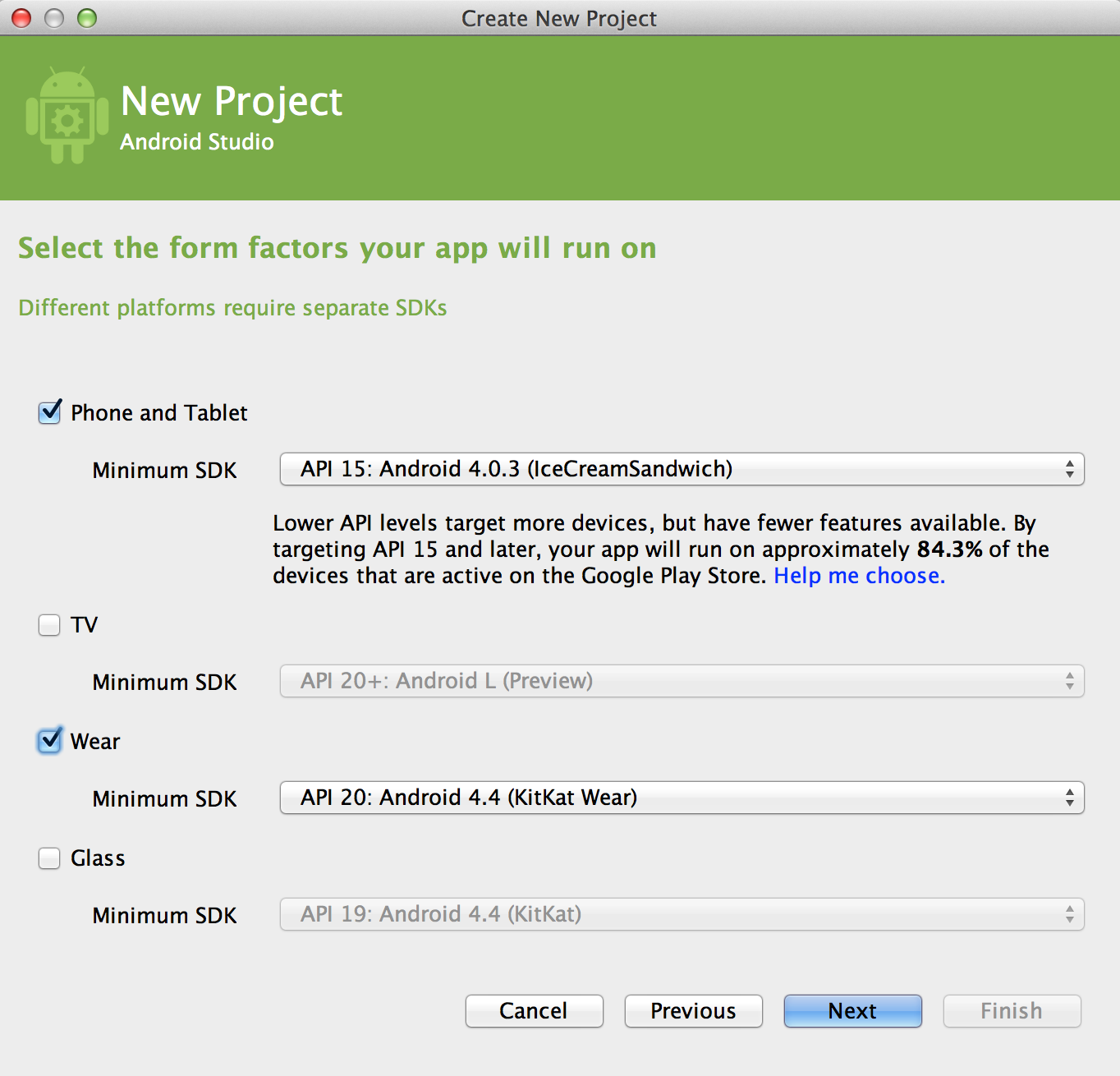 Android Studio makes it easy to create Android apps for several form factors, such as phone, tablet, TV, Wear, and Google Glass. The New Project wizard lets you choose the form factors for your app and populates the project structure with everything you need to get started.