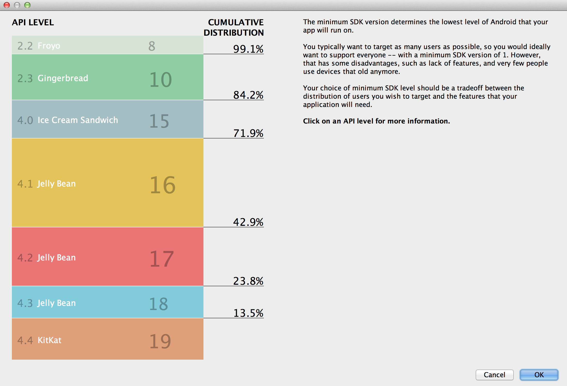 The API Level window shows the distribution of mobile devices running each version of Android, as shown in figure 3. Click on an API level to see a list of features introduced in the corresponding version of Android. This helps you choose the minimum API Level that has all the features that your apps needs, so you can reach as many devices as possible. Then click OK.