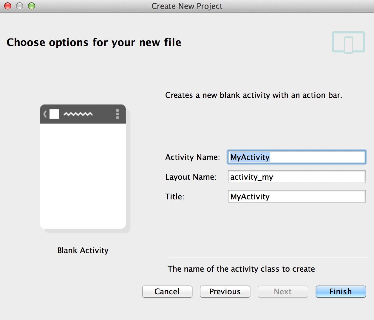 Enter the activity name, the layout name, and the activity title. Then click Finish.