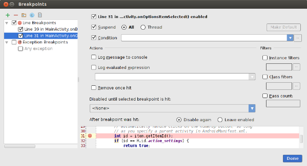 The Breakpoints window lets you enable or disable each breakpoint from the list on the left. If a breakpoint is disabled, Android Studio does not pause your app when it hits that breakpoint. Select a breakpoint from the list to configure its settings. You can configure a breakpoint to be disabled at first and have the system enable it after a different breakpoint is hit. You can also configure whether a breakpoint should be disabled after it is hit. To set a breakpoint for any exception, select Exception Breakpoints in the list of breakpoints.