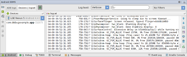 3. On the Android DDMS tool window, select the Devices | logcat tab.