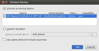 Figure 1. The Choose Device window enables you to select a physical Android device or a virtual device to debug your app.