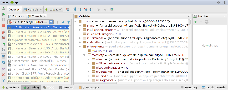 Android Studio pauses the execution of your app when it reaches the breakpoint. You can then use the tools in the Debug tool window to identify the cause of the error.