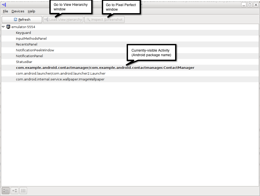 5. The first window you see displays a list of devices and emulators. To expand the list of Activity objects for a device or emulator, click the arrow on the left. This displays a list of the Activity objects whose UI is currently visible on the device or emulator. The objects are listed by their Android component name. The list includes both your application Activity and system Activity objects. A screenshot of this window appears in figure 1.