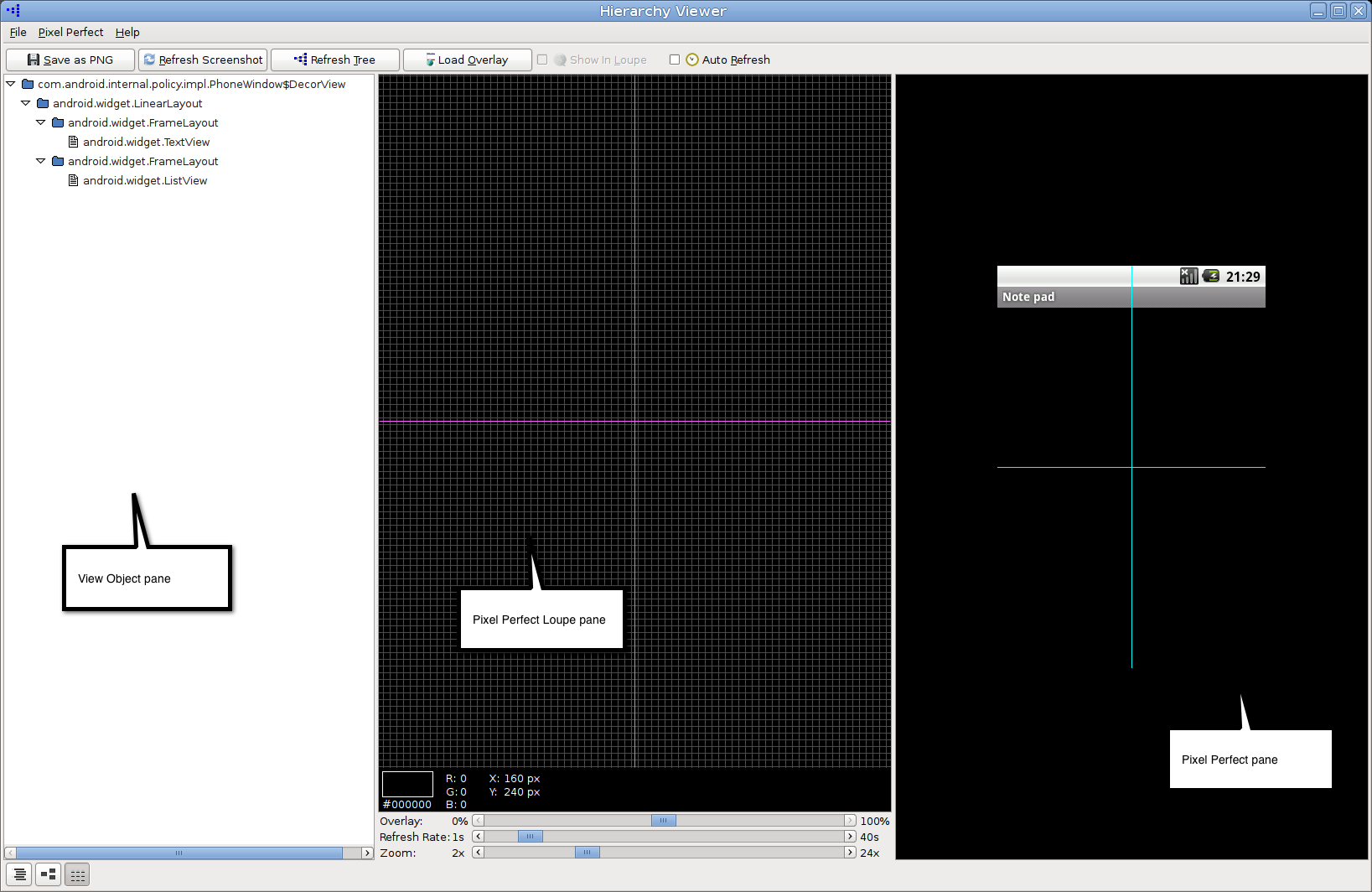 • View Object pane: This is a hierarchical list of the View objects that are currently visible on the device or emulator screen, including both the ones in your application and the ones generated by the system. The objects are listed by their View class. To see the class names of a View object's children, expand the View by clicking the arrow to its left. When you click a View, its position is highlighted in the Pixel Perfect pane on the right.