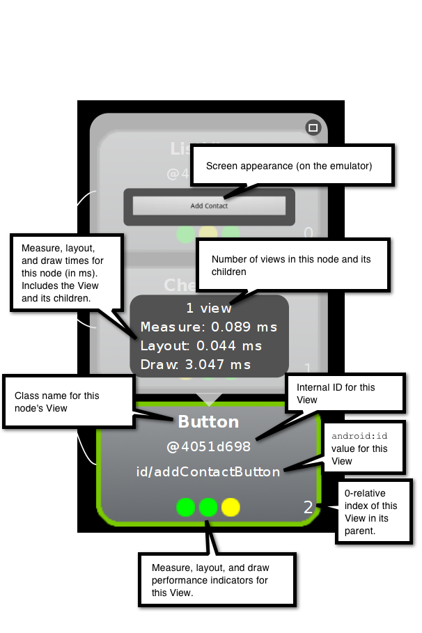 4. Performance indicators: A set of three colored dots that indicate the rendering speed of this View relative to other View objects in the tree. The three dots represent (from left to right) the measure, layout, and draw times of the rendering.