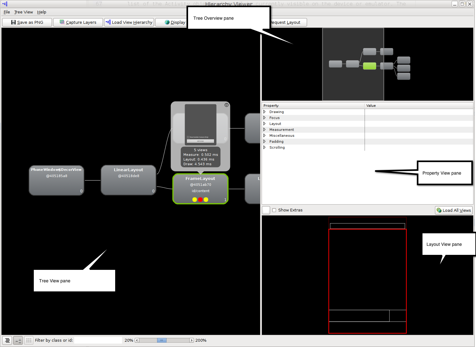 The Hierarchy Viewer application allows you to debug and optimize your user interface. It provides a visual representation of the layout's View hierarchy (the View Hierarchy window) with performance information for each node in the layout, and a magnified view of the display (the Pixel Perfect window) to closely examine the pixels in your layout.