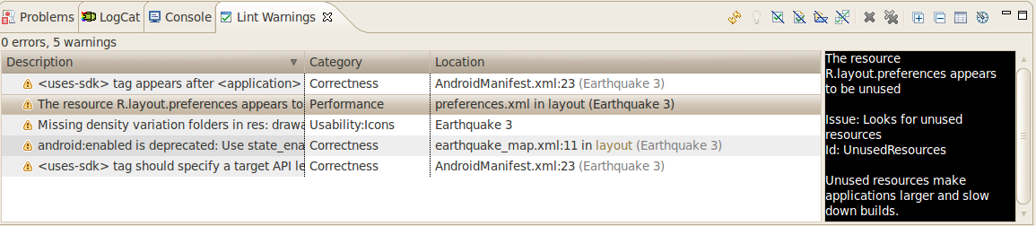 You can view the results from lint in the console or in the Lint Warnings view in Eclipse. Each issue is identified by the location in the source files where it occurred and a description of the issue.