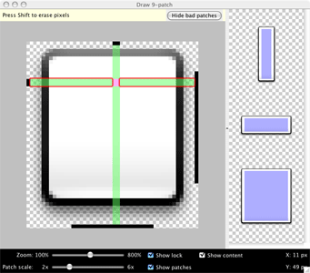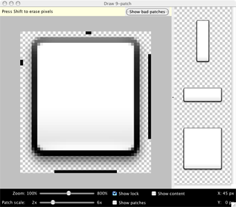 Note: A normal PNG file (*.png) will be loaded with an empty one-pixel border added around the image, in which you can draw the stretchable patches and content area. A previously saved 9-patch file (*.9.png) will be loaded as-is, with no drawing area added, because it already exists.