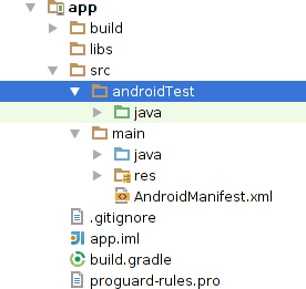 src/main/java/. All other source code files (such as/ActivityName> .java.javaor.aidlfiles) go here as well. androidTest/- Contains the instrumentation tests. For more information, see the Android Test documentation.