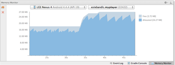 Android Studio provides a memory monitor view so you can more easily monitor your app's memory usage to find deallocated objects, locate memory leaks and track the amount of memory the connected device is using. With your app running on a device or emulator, click the Memory Monitor tab in the lower right corner to launch the memory monitor.