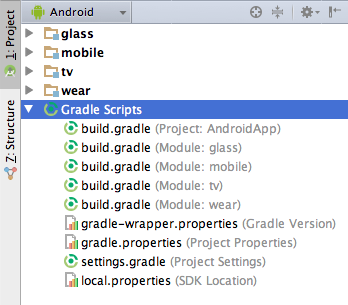 The Android project view shows all the build files at the top level of the project hierarchy under Gradle Scripts. Each project module appears as a folder at the top level of the project hierarchy and contains these three elements at the top level: