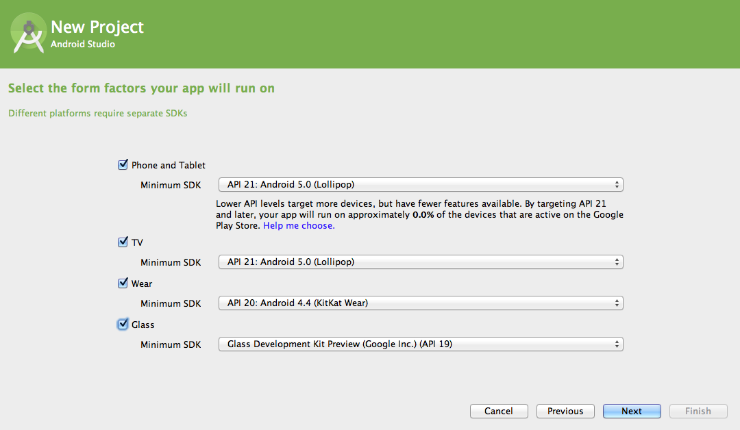 During app creation, the Project Wizard also displays an API Level dialog to help you choose the best minSdkVersion for your project.