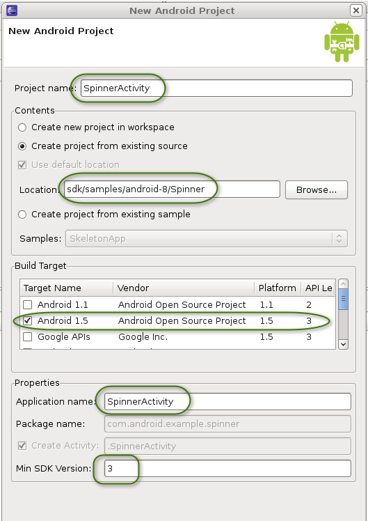 $ android create project -t <APItarget> -k com.android.example.spinner -a SpinnerActivity -n SpinnerActivity -p Spinner