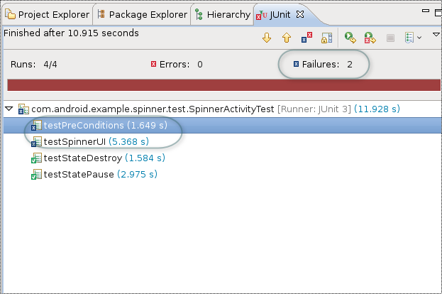 The JUnit view is either created or updated with the results of the test. Now, however, the progress bar is red, the number of failures is 2, and small "x" icons appear in the list icons next to the testPreConditions and TestSpinnerUI tests. This indicates that the tests have failed. The display is similar to this: