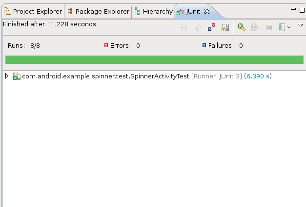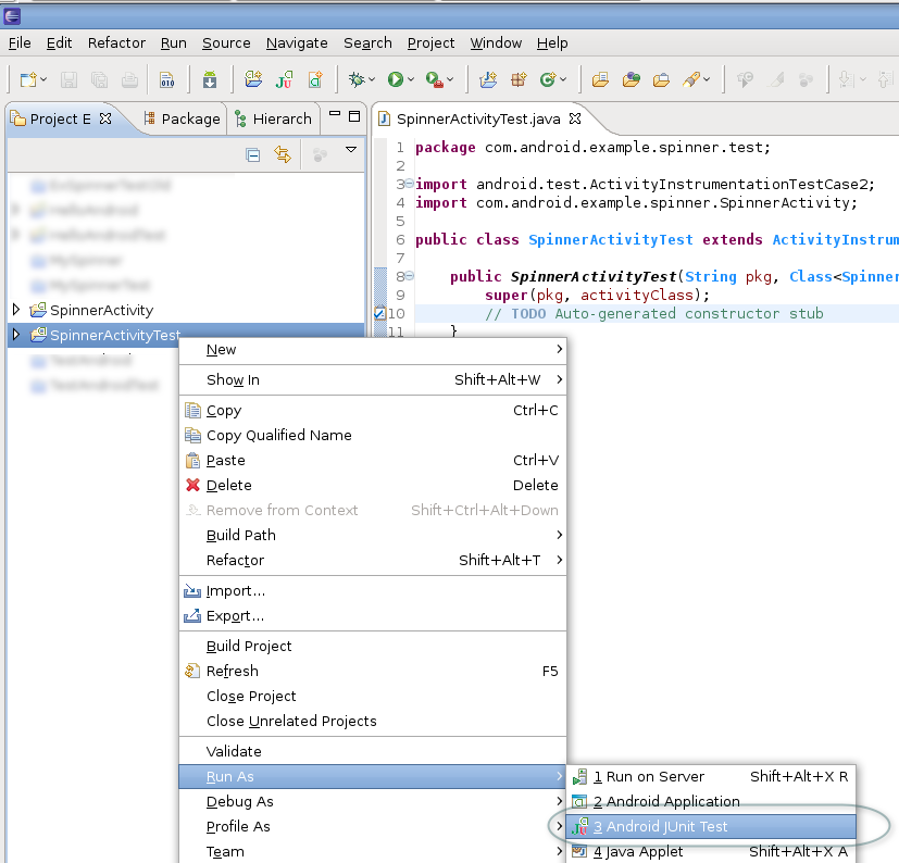 1. In the Package Explorer, expand the test project SpinnerActivityTest if it is not open already.