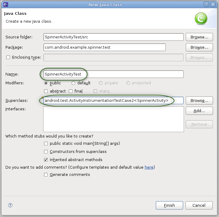 • Superclass: "android.test.ActivityInstrumentationTestCase2<SpinnerActivity>". The superclass is parameterized, so you have to provide it your main application's class name.
