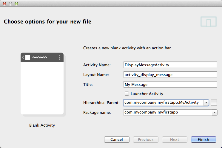 javadirectory, select the package, com.mycompany.myfirstapp, right-click, and select New > Activity > Blank Activity. - In the Choose options window, fill in the activity details: