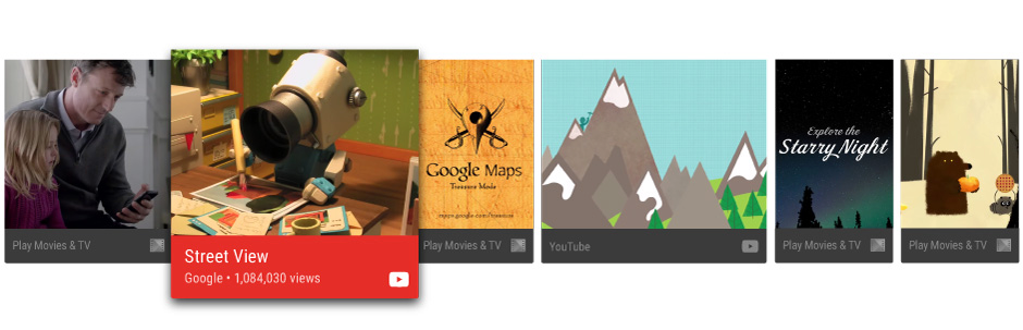 The Android framework assists with minimum-input interaction by providing a recommendations row on the home screen. Content recommendations appear as the first row of the TV home screen after the first use of the device. Contributing recommendations from your app's content catalog can help bring users back to your app.