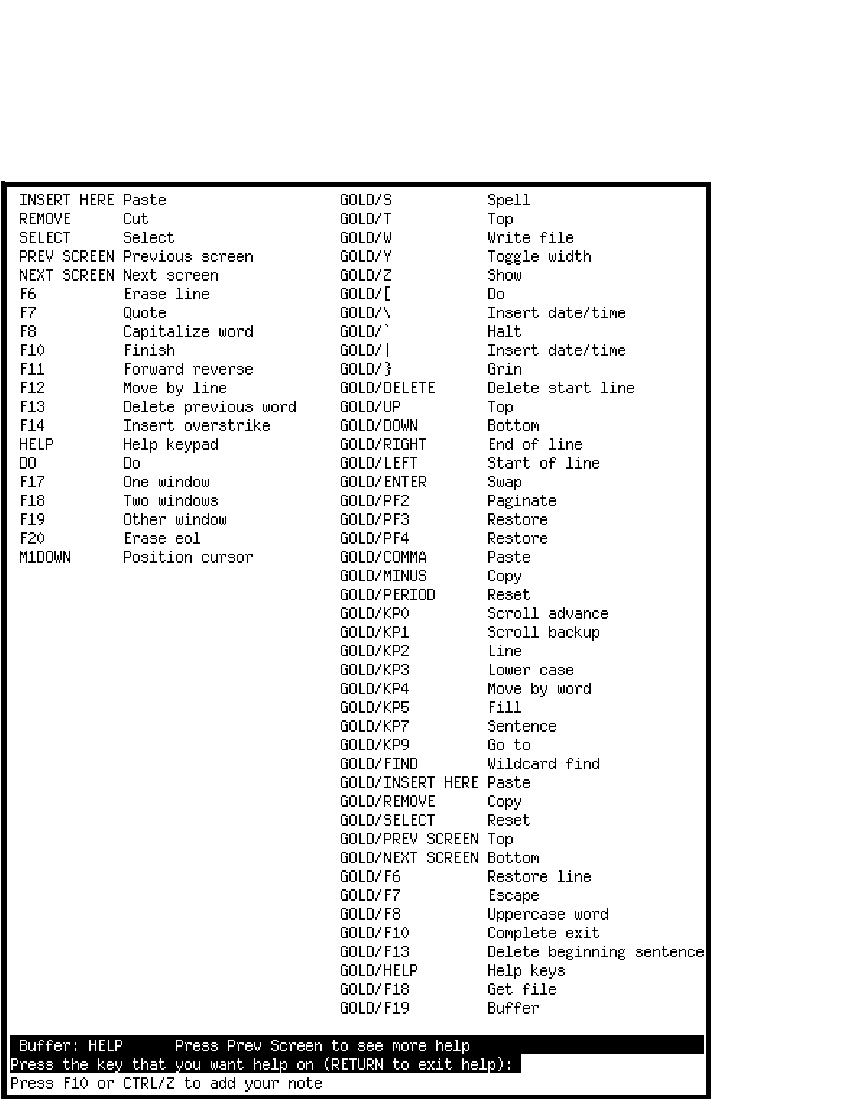 The key definitions display may also be generated anytime you are in edit mode by pressing GOLD-HELP.