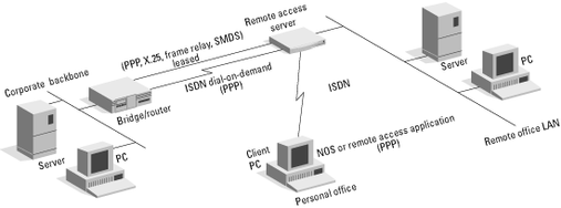 With ISDN, smaller regional and international sites can connect to enterprise networks and to one another much more cost-effectively than with dedicated leased lines. Dial-up ISDN links can replace leased-line connections altogether or be used as supplemental bandwidth for overflow and redundancy. Remote sites and individual remote users can dial in to central networks worldwide and enjoy reliable, high-speed digital connectivity to critical resources, or access and download the ever-increasing wealth of multimedia information on the Internet.