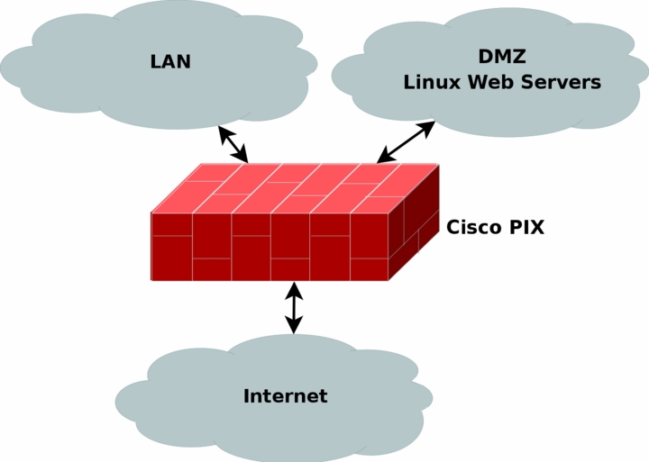 As you can see, in this example I have in this example chosen to place a Cisco PIX firewall at the perimeter of all three network connections. It may NAT the internal LAN, as well as the DMZ if necessary. It may also block all outgoing traffic except http return traffic as well as ftp and ssh traffic. It can allow incoming http traffic from both the LAN and the Internet, and ftp and ssh traffic from the LAN. On top of this, we note that each webserver is based on Linux, and can hence throw iptables and netfilter on each of the machines as well and add the same basic policies on these. This way, if someone manages to break the Cisco PIX, we can still rely on the netfilter firewalls locally on each machine, and vice versa. This allows for so called layered security.
