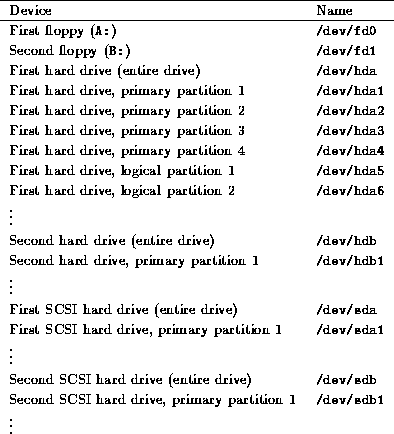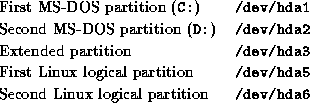 Here's an example. Let's say that you have a single IDE hard drive, with 3 primary partitions. The first two are set aside for MS-DOS, and the third is an extended partition which contains two logical partitions, both for use by Linux. The devices referring to these partitions would be: