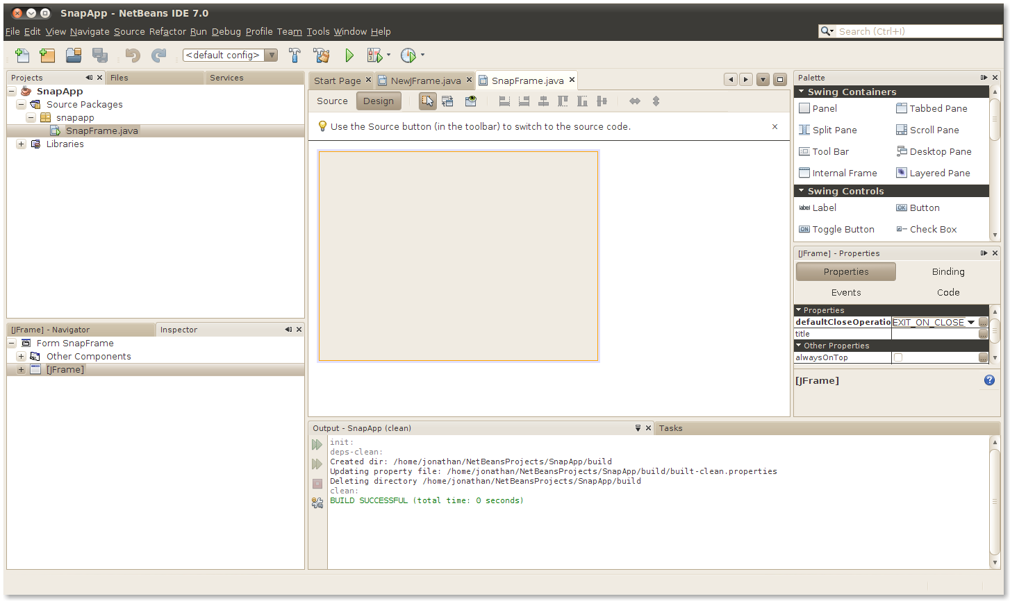 In the Projects pane on the left, you can see the newly created SnapFrame class. In the center of the screen is the NetBeans visual designer. On the right side is the Palette, which contains all the components you can add to the frame in the visual designer.