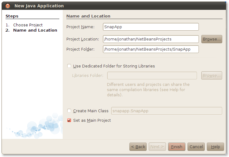 Enter SnapApp as the application name. Uncheck Create Main Class and click Finish. NetBeans creates the new project and you can see it in NetBeans' Projects pane:
