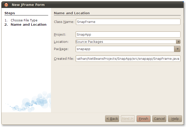 Control-click on the SnapApp project and choose New > JFrame Form... from the popup menu.
