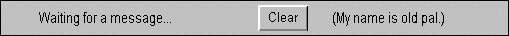 Try this: Click the Send message button of the top applet (the Sender). Some status information will appear in the Sender's window, and the Receiver will confirm (with its own status string) that it received a message, After you've read the Receiver status string, press the Receiver's Clear button to reset the Receiver. In the Sender's text field labeled "Receiver name:," type in buddy and press Return. Since "buddy" is the Sender's own name, the Sender will find an applet named buddy but won't send it a message, since it isn't a Receiver instance.