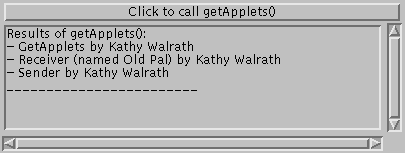 Note: Some browsers let applets invoke methods on other applets -- even applets on different pages in the same browser -- as long as all of the applets come from the same code base. This method of interapplet communication isn't supported by the Java API, so it's possible that it will not be supported by all browsers.